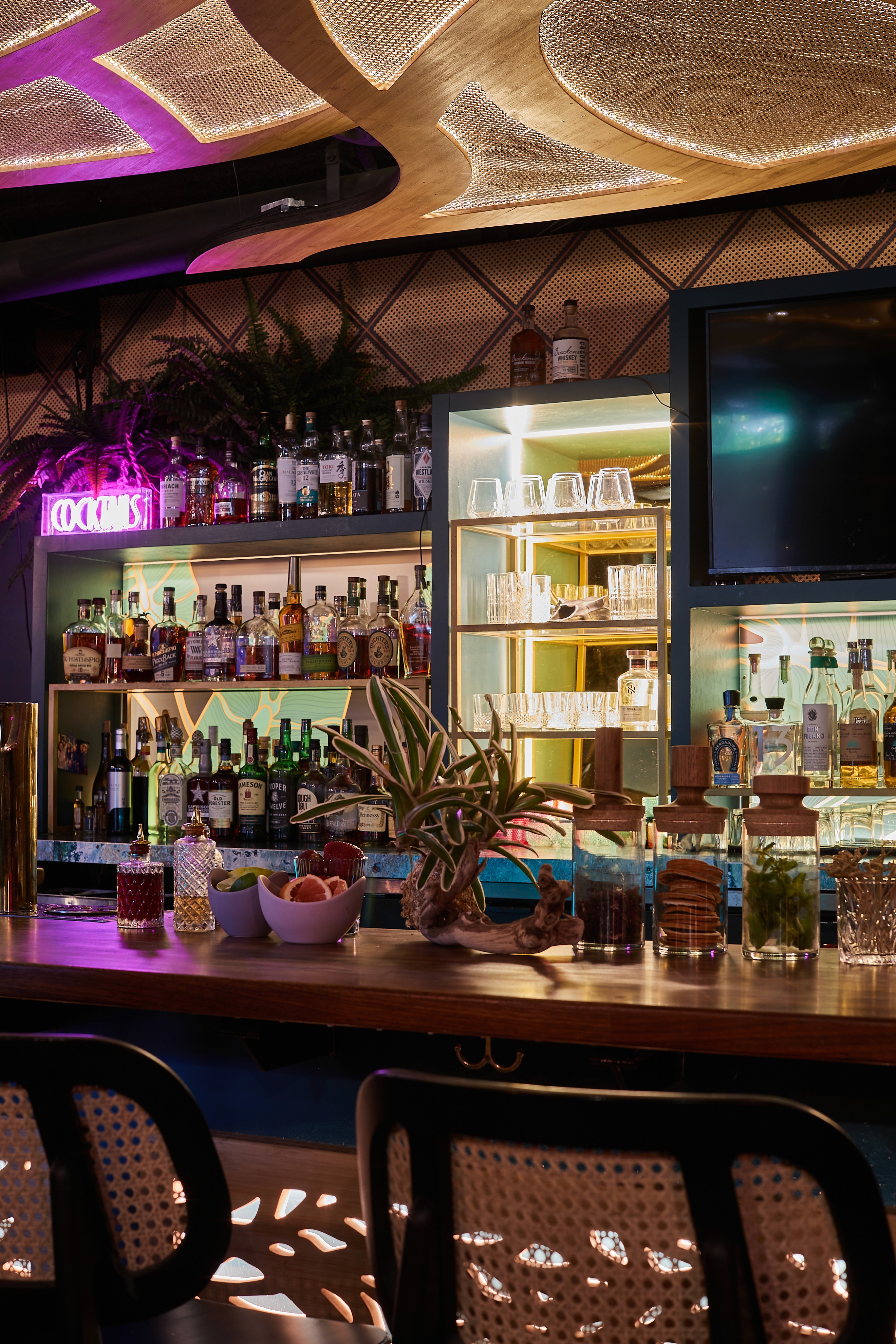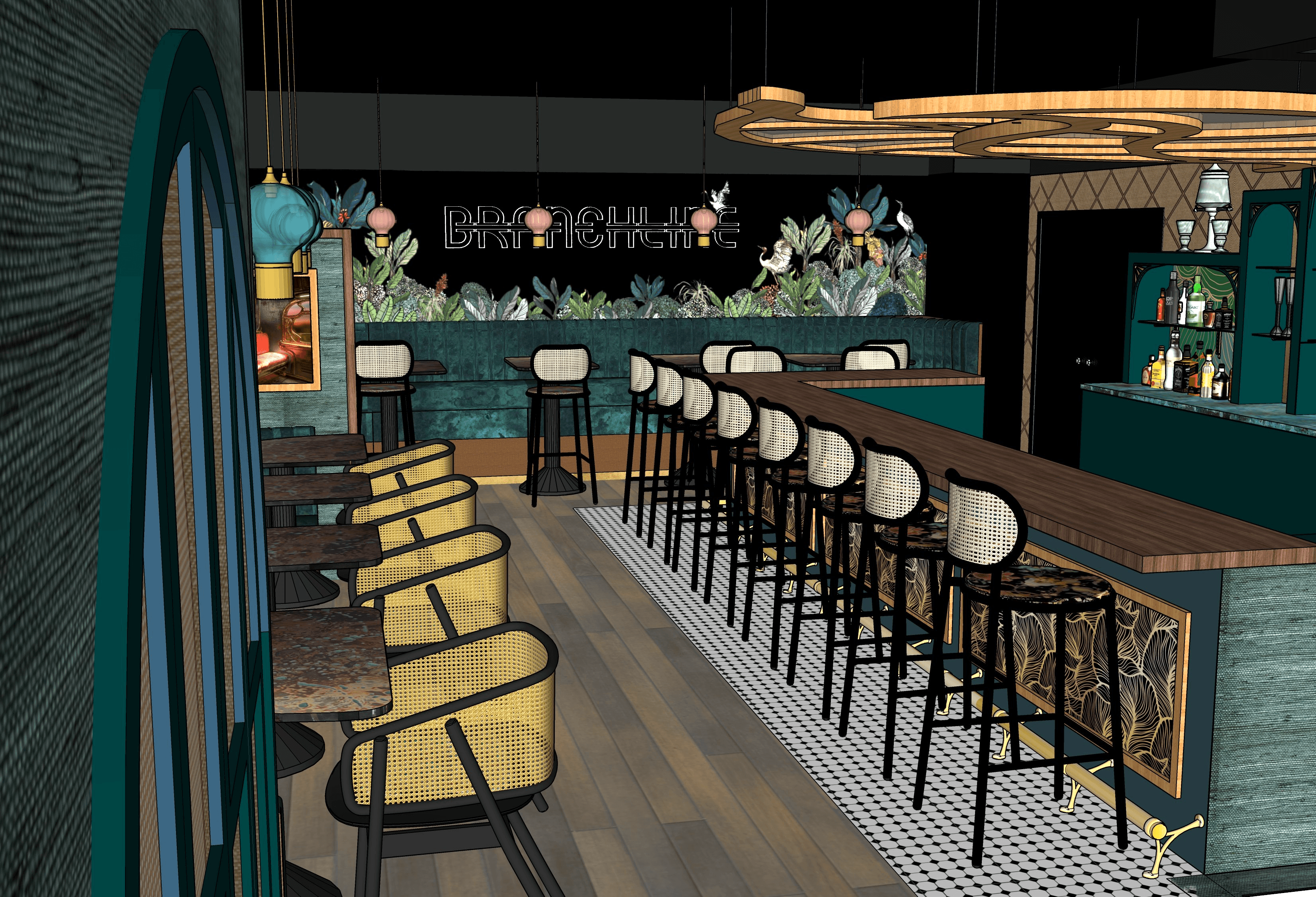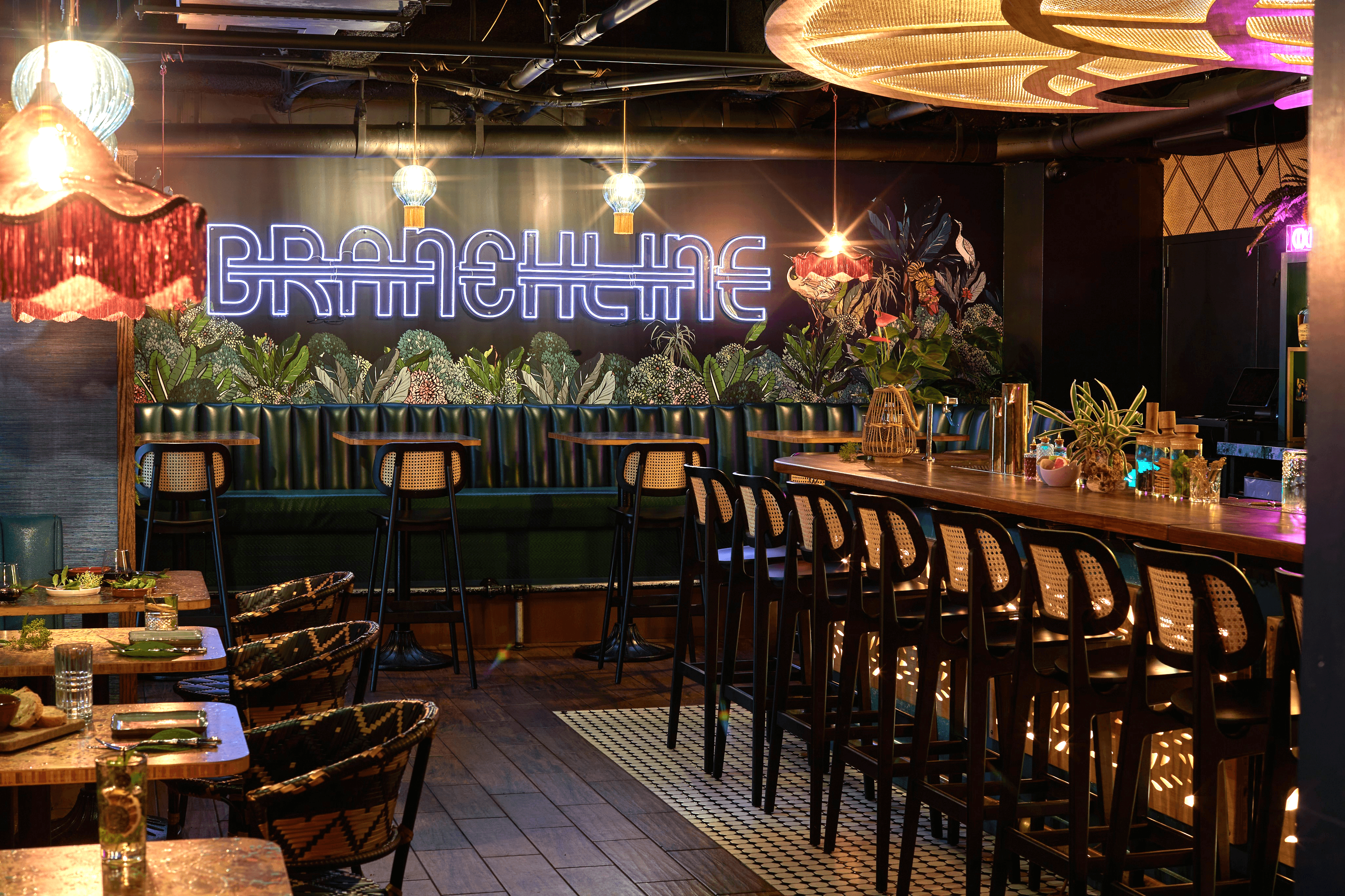 Branchline blends a refined, unpretentious speakeasy vibe- its lush interior is anchored by custom sculptural leaf-shaped lights that crown the bar. The brand identity echoes the nearby railway with a sleek, track-inspired logo.