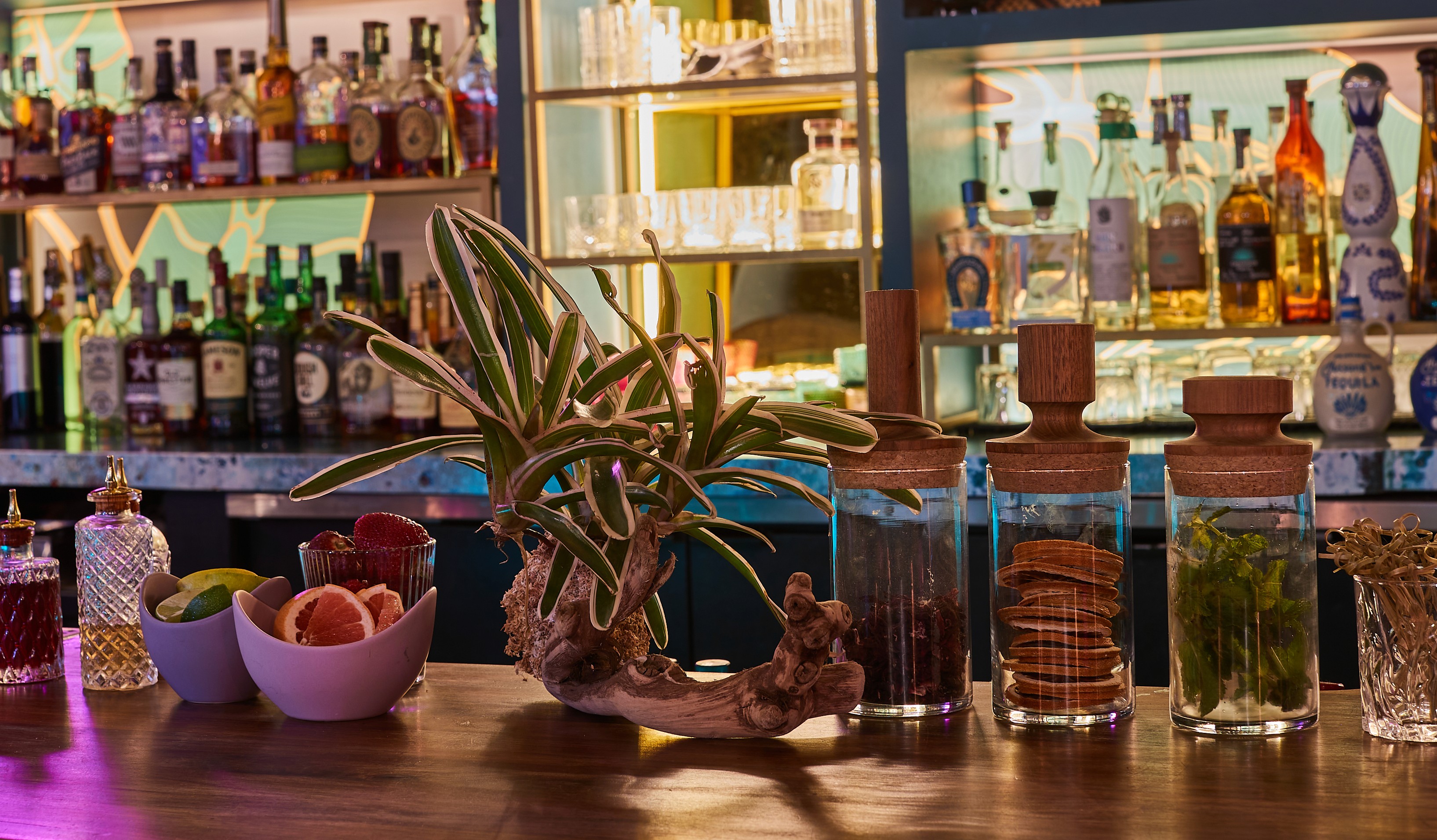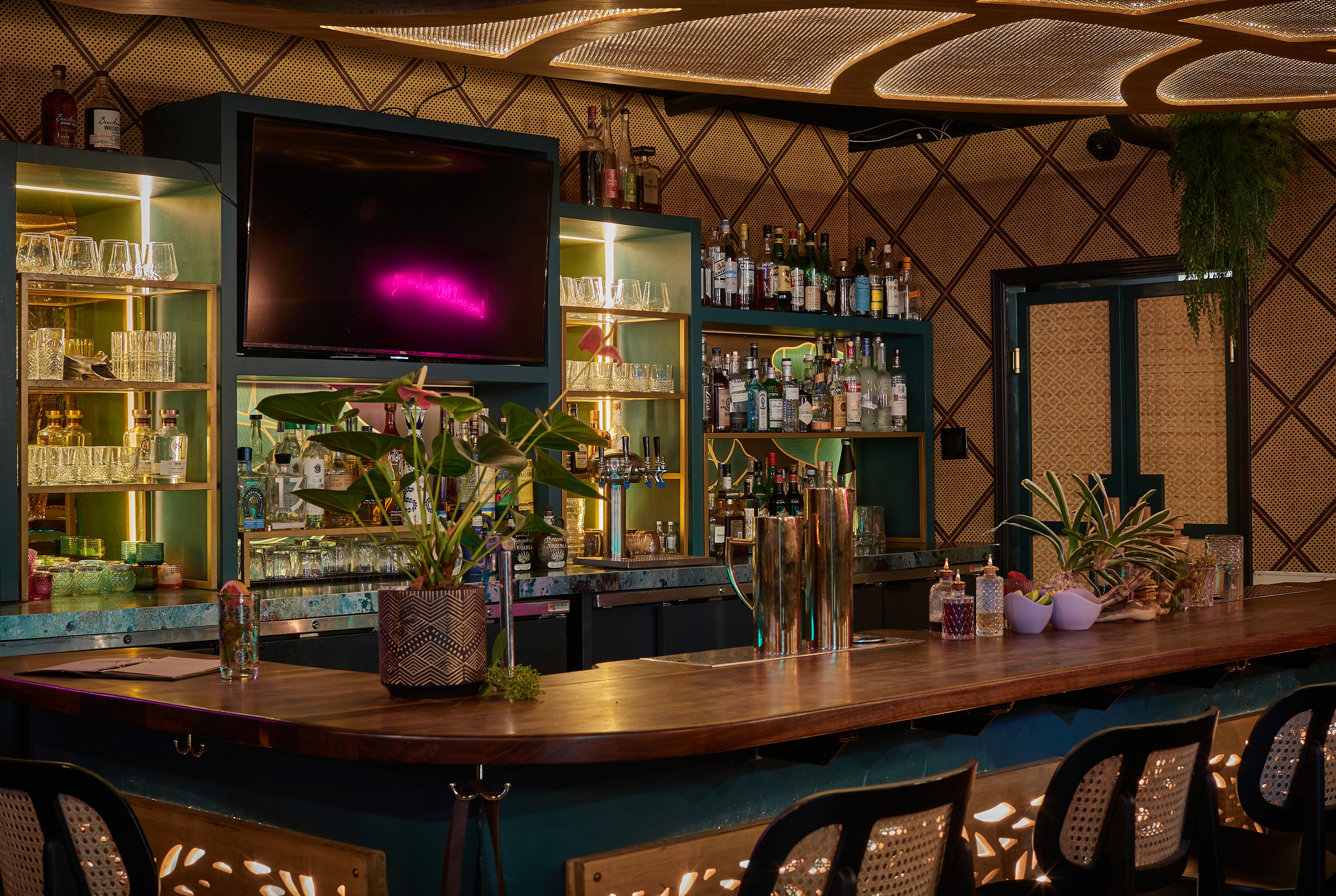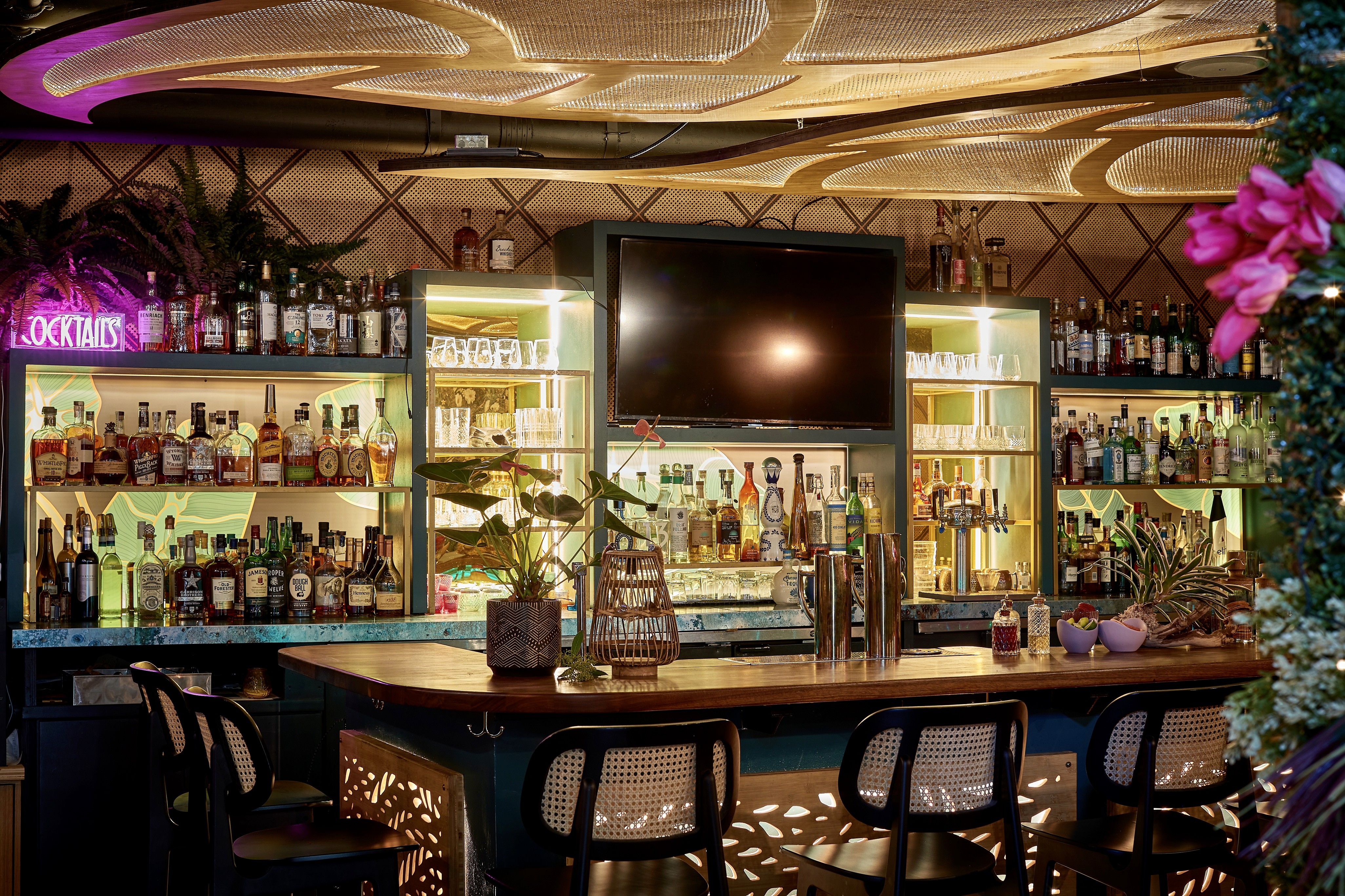 Branchline blends a refined, unpretentious speakeasy vibe- its lush interior is anchored by custom sculptural leaf-shaped lights that crown the bar. The brand identity echoes the nearby railway with a sleek, track-inspired logo.